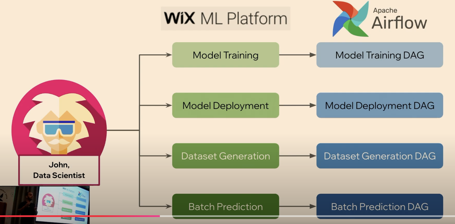 MLOps is one of the fastest growing use cases for Airflow. Wix uses Airflow’s API and Python libraries to integrate it seamlessly into their ML platform, supporting three main roles: