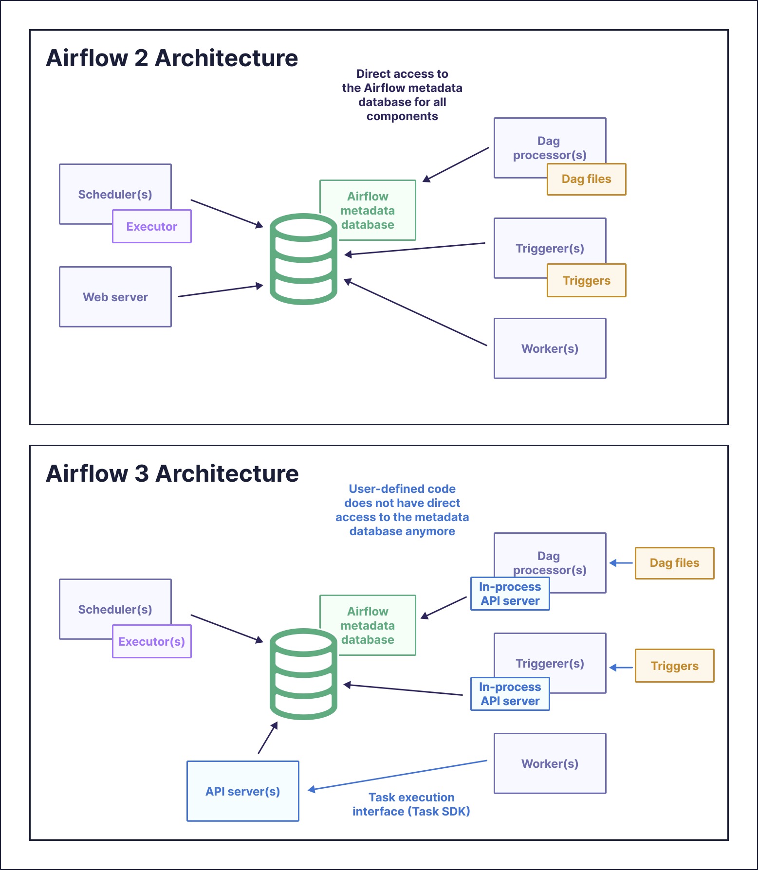 One of the most consequential enhancements in Airflow 3 is the decoupling of task execution from other Airflow system components, which has a primary benefit of greater security. Rather than having worker processes write directly to the Airflow metadata database, tasks call an API server to receive and report job statuses.