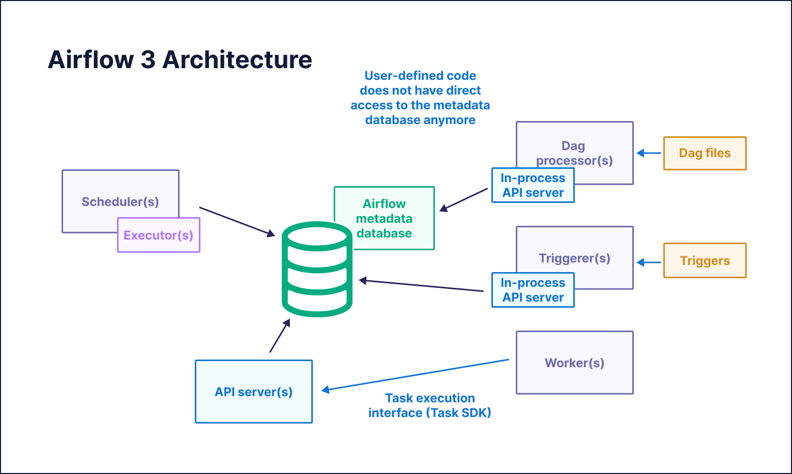 Airflow 3’s architecture was rebuilt from the ground up separating user defined task code from the code that executes tasks entirely. This decoupling led to a new secure paradigm in which all requests for metadata information from user-defined code go through the new API server component, instead of directly accessing the Airflow metadata database.
