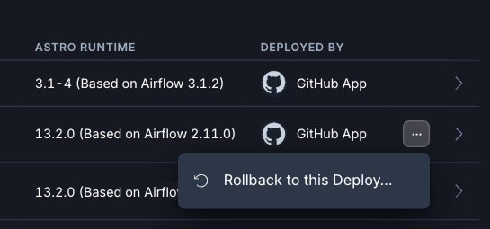 Figure: Screenshot of the Astro UI showing how to roll back from an Airflow 3 to an Airflow 2 version of a Deployment.