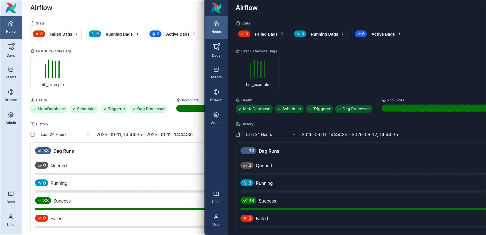 Figure: Screenshot of the new React-based UI of Airflow 3 in light and dark mode.