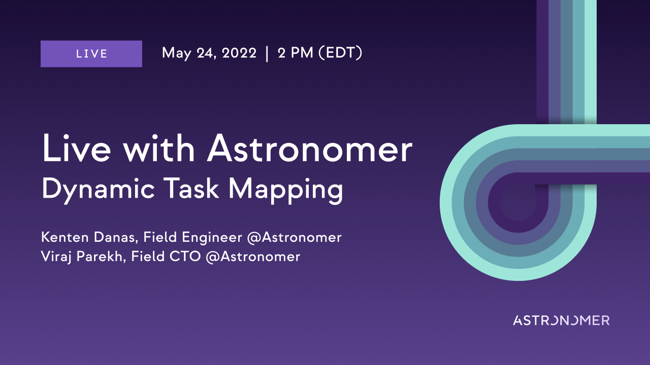 On May 24, Live with Astronomer will dive into the Dynamic Task Mapping feature introduced in Airflow 2.3. We’ll show how to easily add dynamic tasks to your DAGs, and discuss ways to make the best use of this feature.