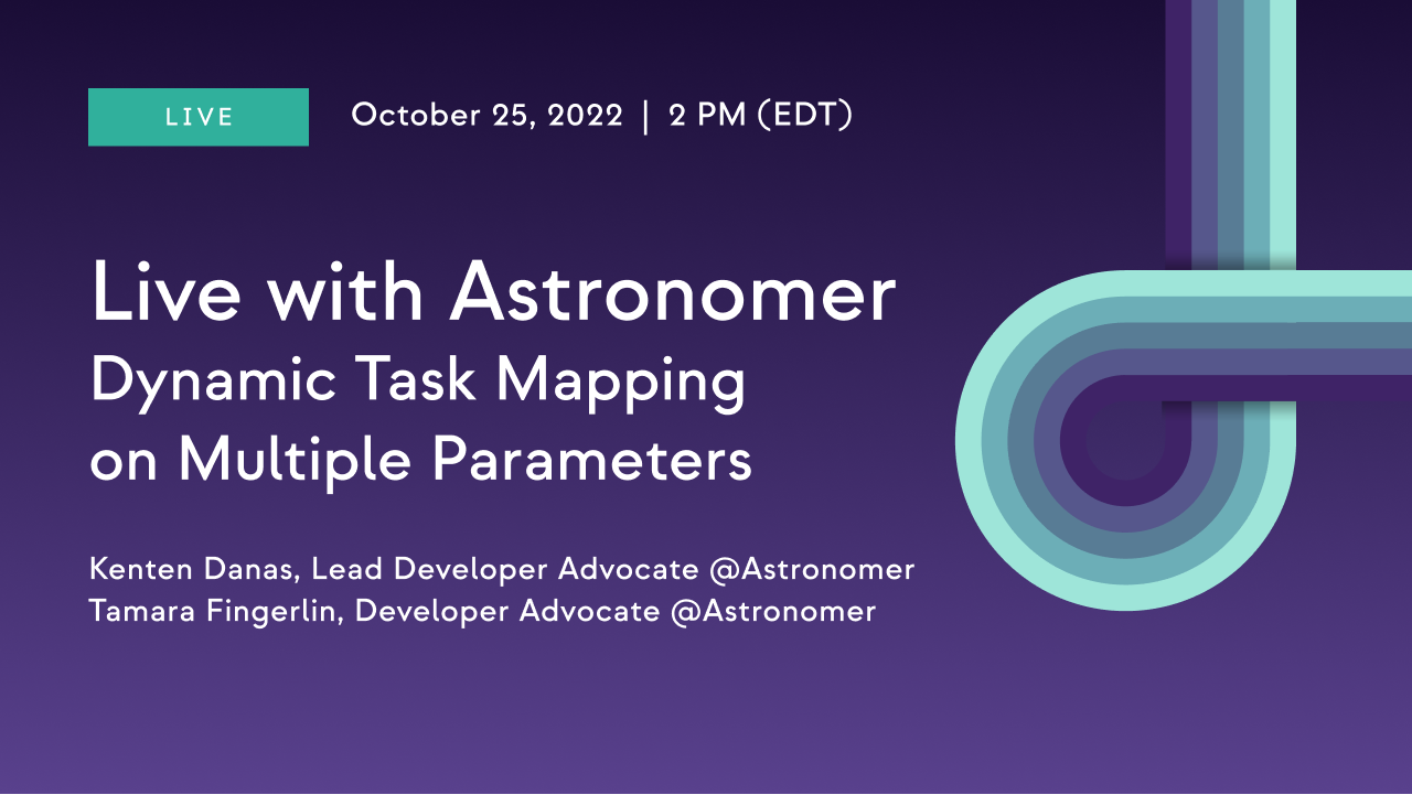 On October 25, Live with Astronomer will dive into updates to the dynamic task mapping feature released in Airflow 2.4. We’ll show a couple of new methods for mapping over multiple parameters, and discuss how to choose the best mapping method for your use case.