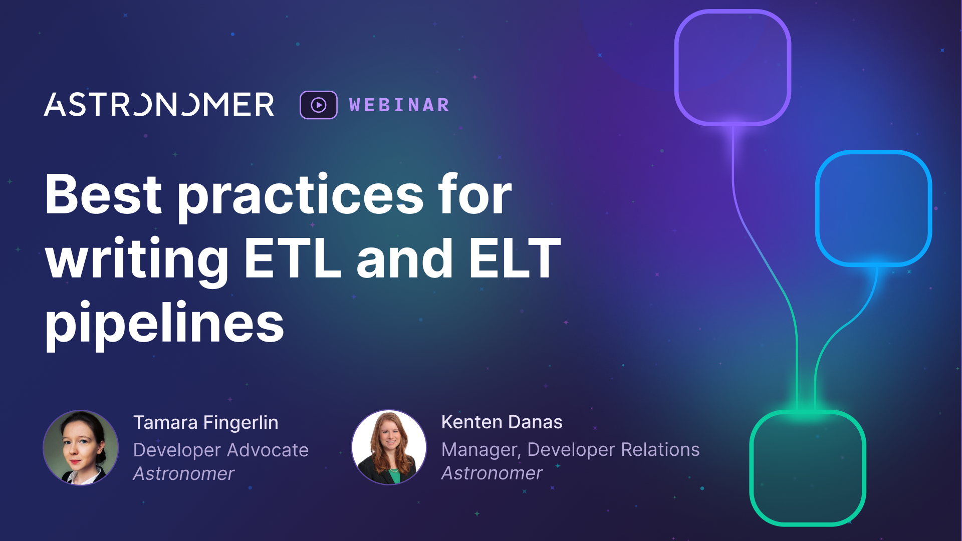 In this webinar, we’ll cover DAG writing best practices applicable to ETL and ELT pipelines, including things like how to approach building ETL and ELT pipelines from scratch.