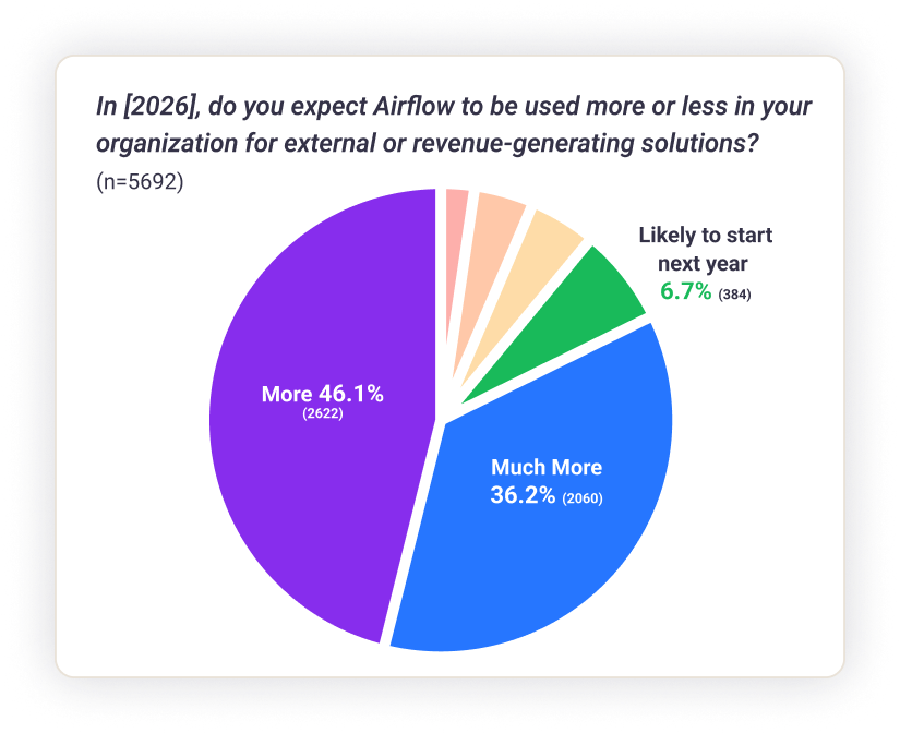 Airflow supports more than internal dashboards. 89% of users expect to use Airflow for more revenue-generating and/or external solutions next year, while ETL and ELT remain foundational use cases.
