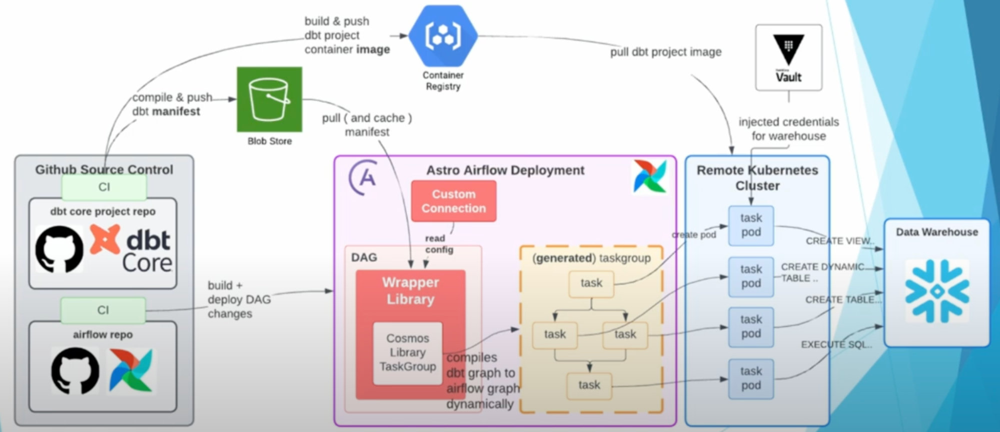 - Cosmos Integration: A wrapper around Cosmos translates dbt manifests into Airflow task groups, with each dbt model running as a Kubernetes pod.