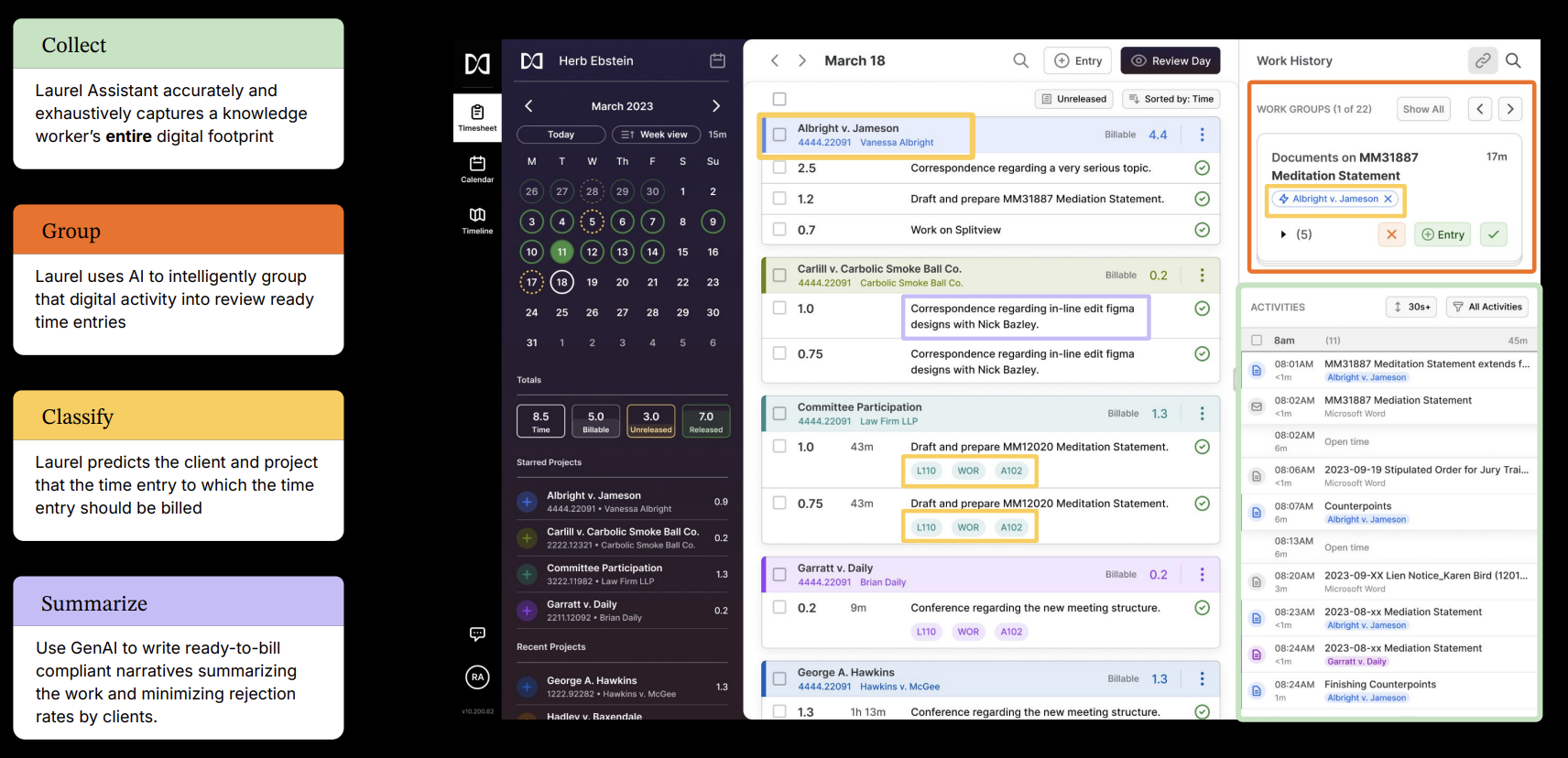 Figure 1: Laurel’s GenAI models accurately calculate billable hours by collecting, grouping, classifying, and summarizing employee activities from their digital footprint. Image source.