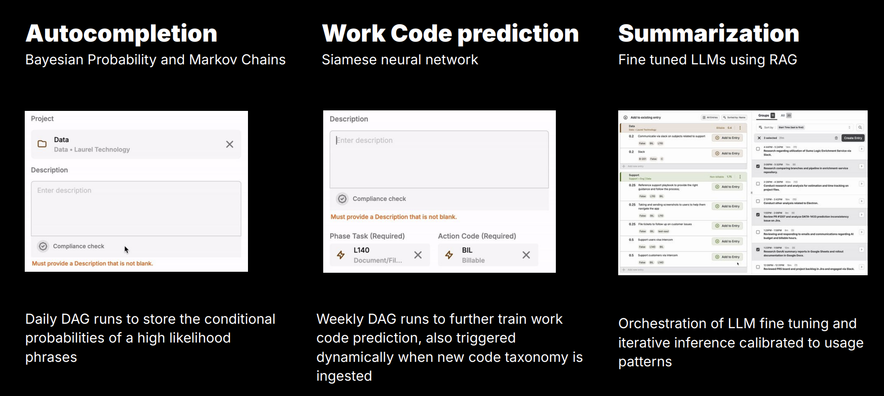 - More powerful LLMs run periodically in Airflow DAGs, summarizing daily activities just before users review their timesheets.