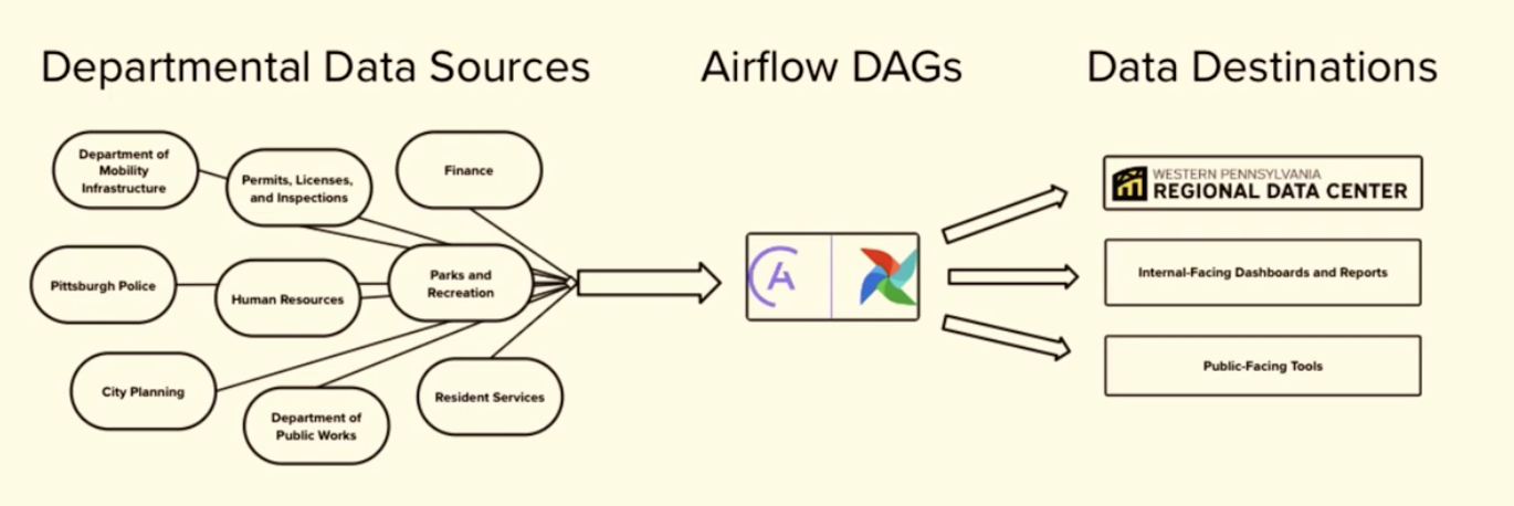 Pittsburgh's data universe now spans parks and recreation, human resources, criminal justice, permits, tax data, and more. The team manages dozens of pipelines through Airflow and Astro. That number might seem modest compared to larger Airflow deployments, but each pipeline represents its own cross-departmental project, its own champion, and its own negotiation with a city department.