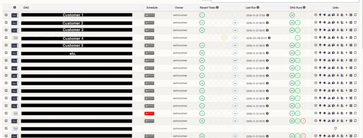 When starting, we figured it’d be easiest to run one massive Airflow deployment that contained all of our org-wide DAGs: one for each customer Redshift connection, one for each each reporting pipeline, and pipelines for all other internal workflows.