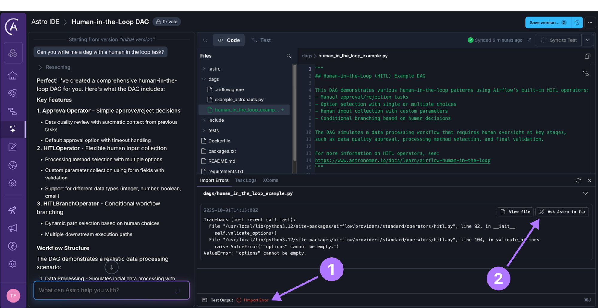 Screenshot of the Astro IDE after starting the test deployment. Clicking on the red import error (1) opens the stack trace directly in the IDE and the Ask Astro to fix button (2) aids you in debugging.