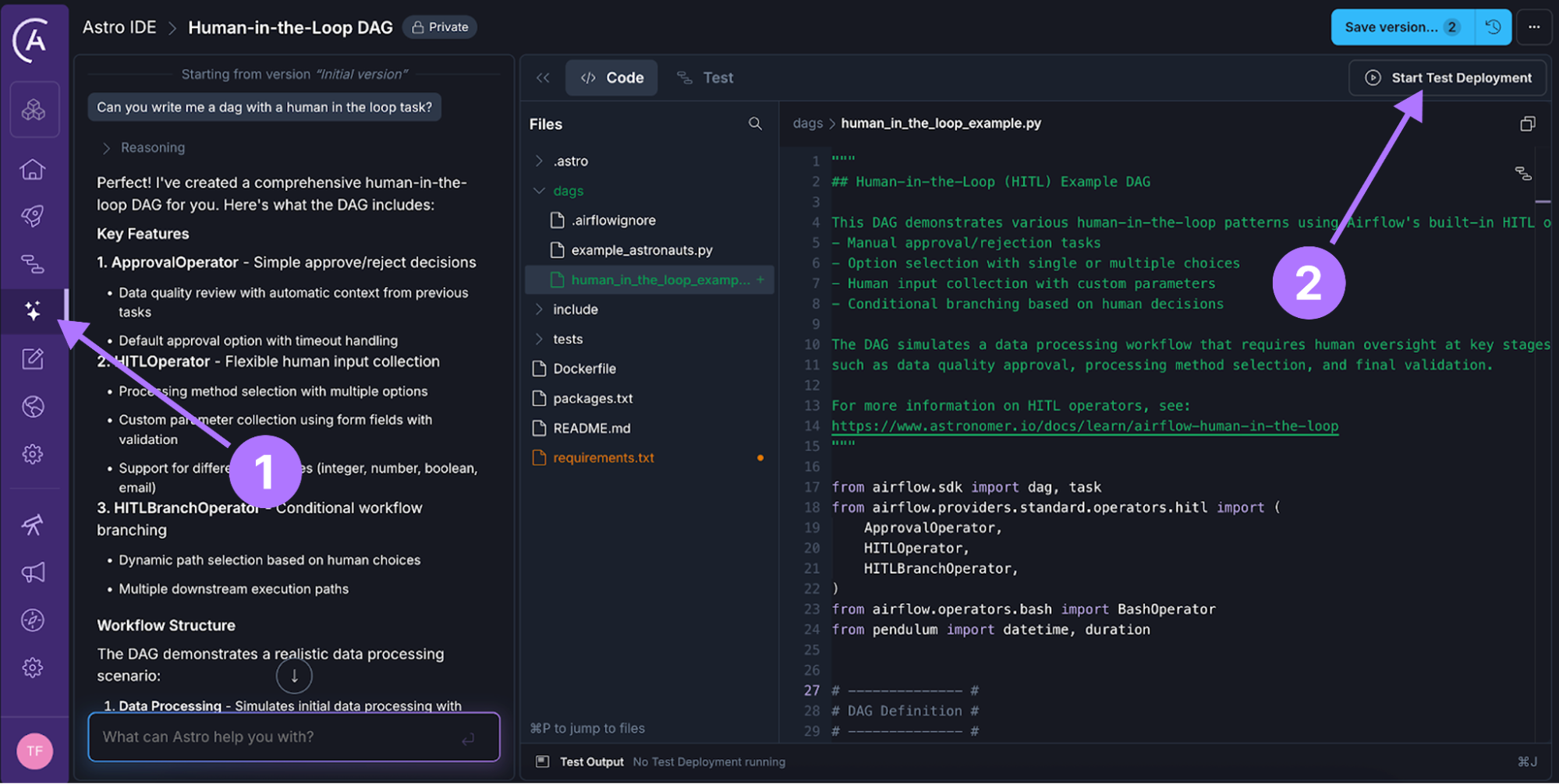 Screenshot of the Astro IDE after letting the AI assistant generate the dag. 1: You can find the Astro IDE in the sidebar under the star icon. 2: You can start a test deployment using the button in the top right corner.