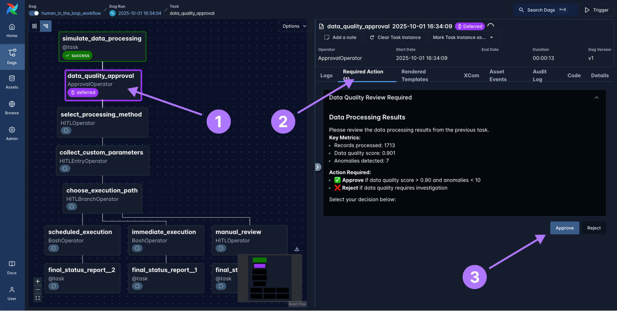 Screenshot of the Airflow 3.1 UI showing the dag the Astro IDE generated with the first human-in-the-loop operator in its deferred state and the contents of the Required Actions tab. You can respond to a required action (be the human in the loop) by clicking on the task instance (1) then on Required Actions (2) and then, after optionally providing additional input, choosing a response (3).