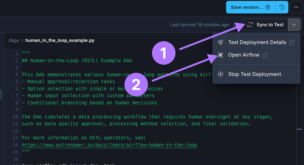 Without even reviewing the code, I clicked on “Start Test Deployment”, curious to see the dag the AI had produced and if it correctly implemented the new human-in-the-loop feature.