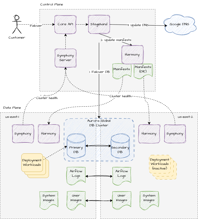 Cross-region disaster recovery (DR) on Astro is now generally available for our AWS data planes, giving customers the ability to fail over their Airflow workloads to a secondary region with a single click. This post covers how we designed and built it: the architecture decisions, the trade-offs, and what we learned along the way.