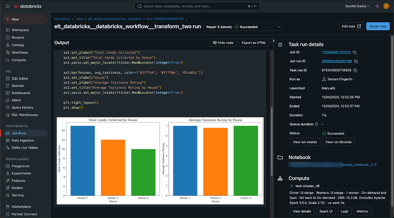 In Databricks, navigate to your Databricks job and click on the second green square to open the notebook run for the second notebook, creating a visualization of total candy and average tastiness rating by house.