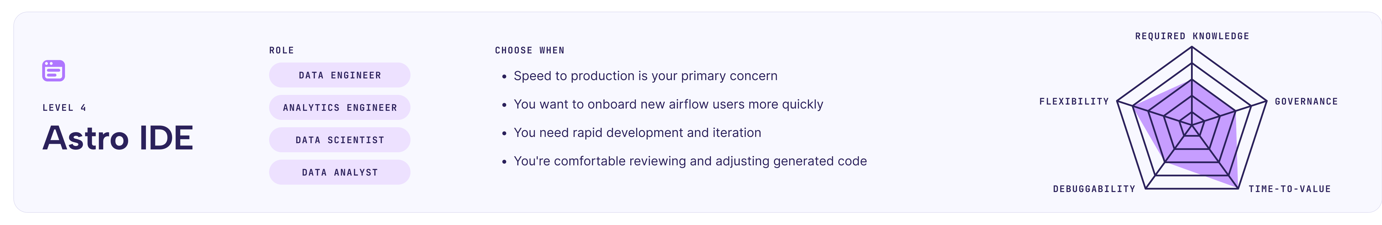 | Attribute | Python (Level 1) | DAG Factory (Level 2) | Blueprint (Level 3) | Astro IDE (Level 4) |