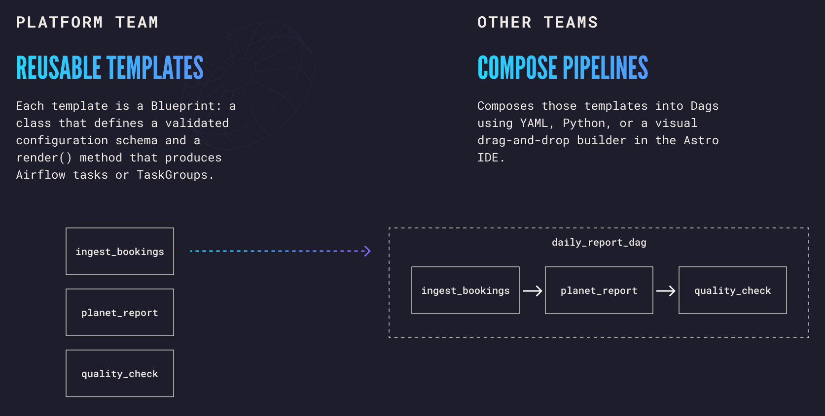 - Analysts and data scientists compose Dags from those blueprints using YAML or the Astro IDE visual builder. They configure the what (connection, table, schedule) without touching the how (operators, SQL templates, retry logic).