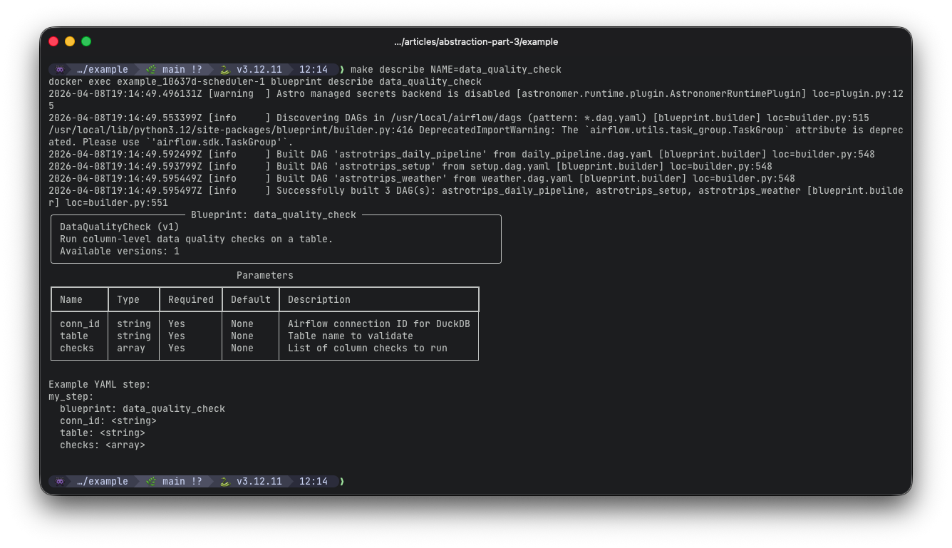 - 1The YAML is flat and readable. Each step references a blueprint by name and provides configuration values. Dependencies are explicit with depends_on. Everything else (conn_id, n_bookings, table, checks) is passed directly to the blueprint's Pydantic model for validation.