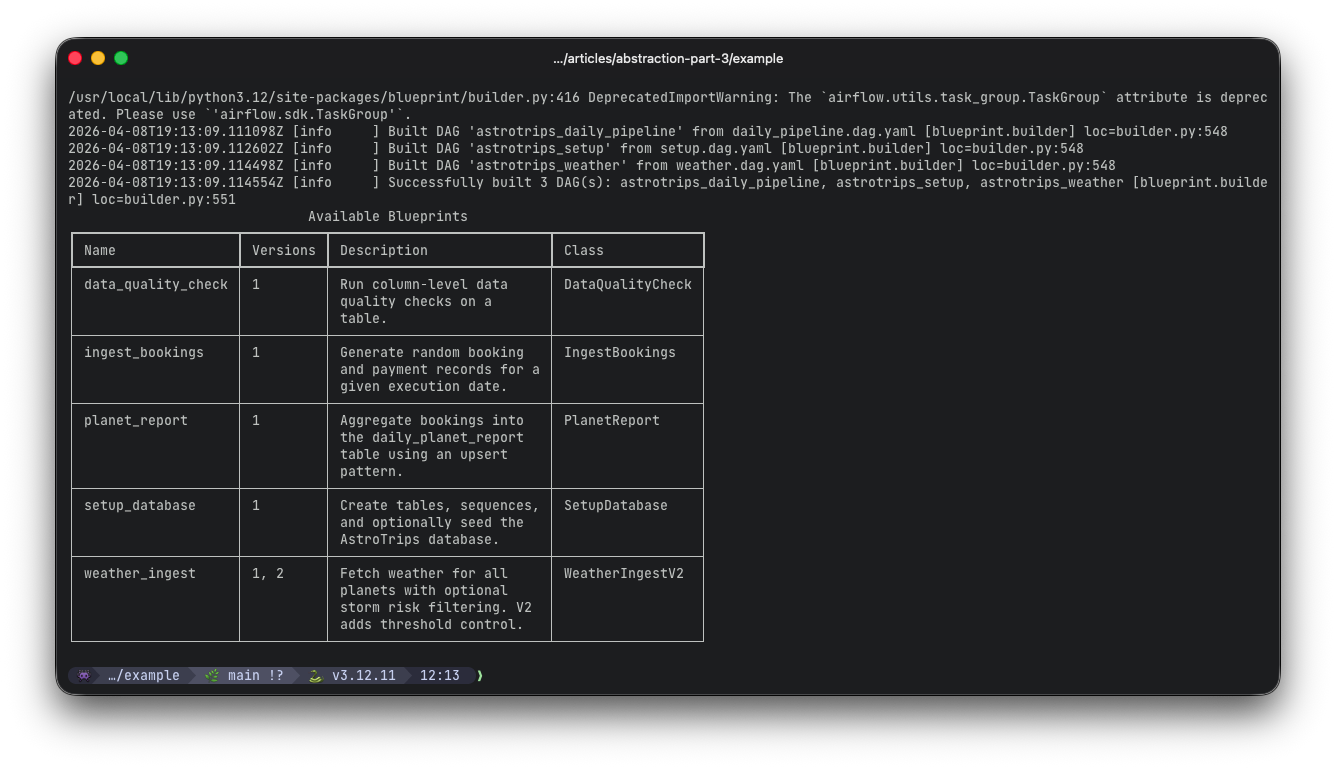 Blueprint is an open-source Python library from Astronomer (published on PyPI as airflow-blueprint) that introduces a clean separation between two roles: