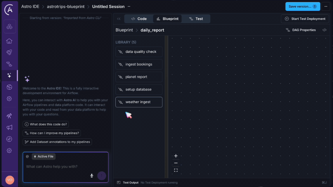 - Validate. Click Start Test Deployment to spin up an ephemeral Airflow environment and run individual tasks or the full Dag. If errors surface, review them inline. Use Ask AI to Fix for suggestions on configuration issues.