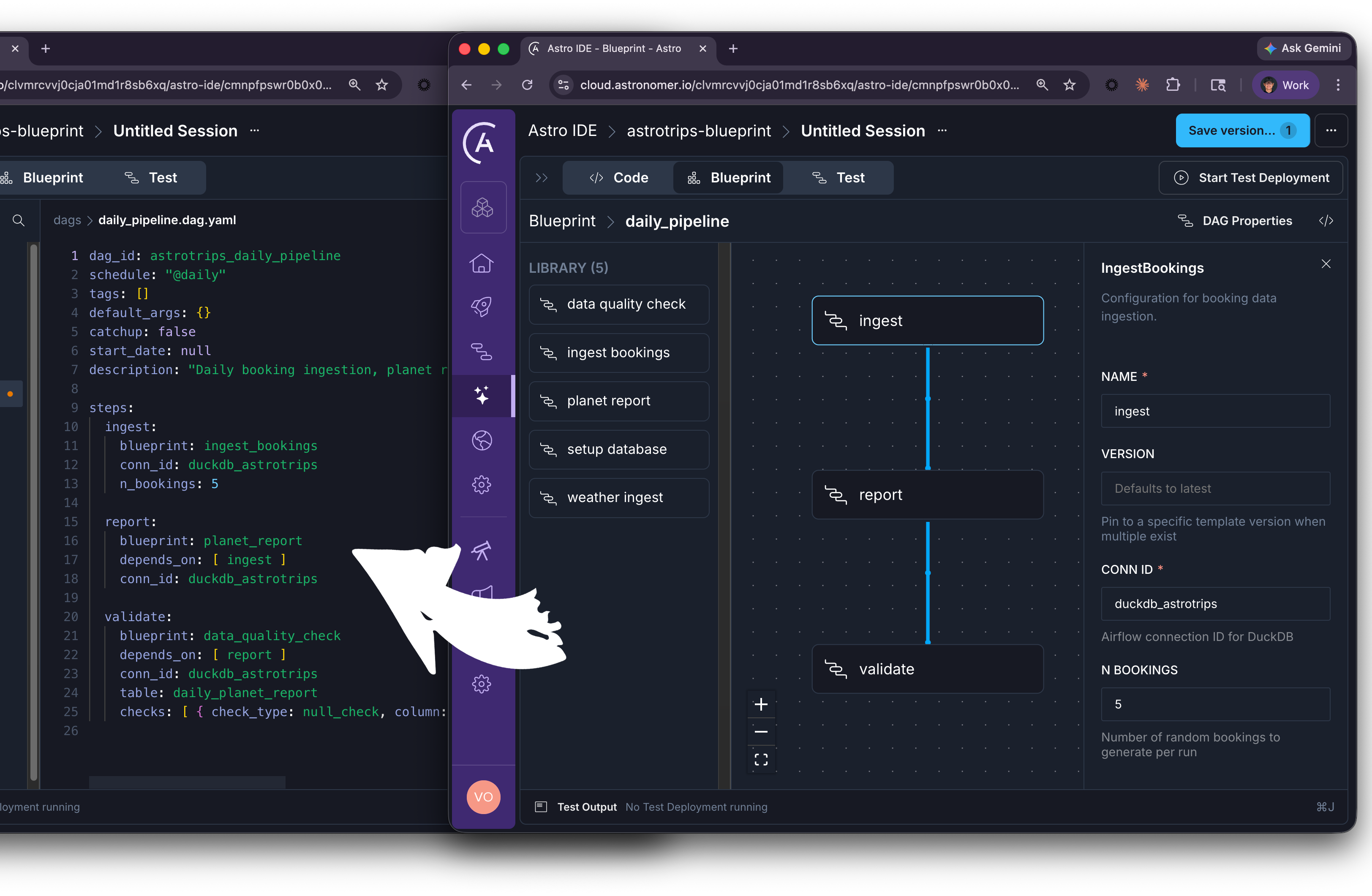 Imagine the AstroTrips blueprints we just built. In the Astro IDE, an analyst would see IngestBookings, PlanetReport, DataQualityCheck, and WeatherIngest listed in the blueprint library. They drag IngestBookings onto the canvas, fill in a form (connection ID, number of bookings), draw a connection to PlanetReport, add a DataQualityCheck downstream, configure the column checks, and hit deploy. The generated output? The exact same .dag.yaml file we wrote by hand earlier.