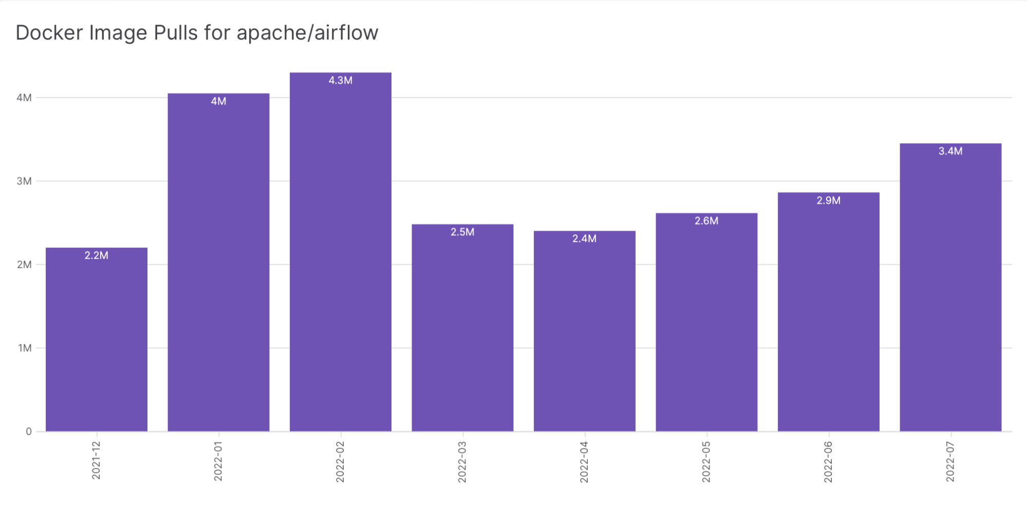 Since the community maintains an official Airflow Docker image, with accompanying Helm chart and docker-compose.yaml, many users also install Airflow using that instead of Python packages. Fortunately, Docker Hub’s public API provides the number of total pulls for an image. We snapshot this every day and load it into our warehouse with — you guessed it — another Airflow DAG:
