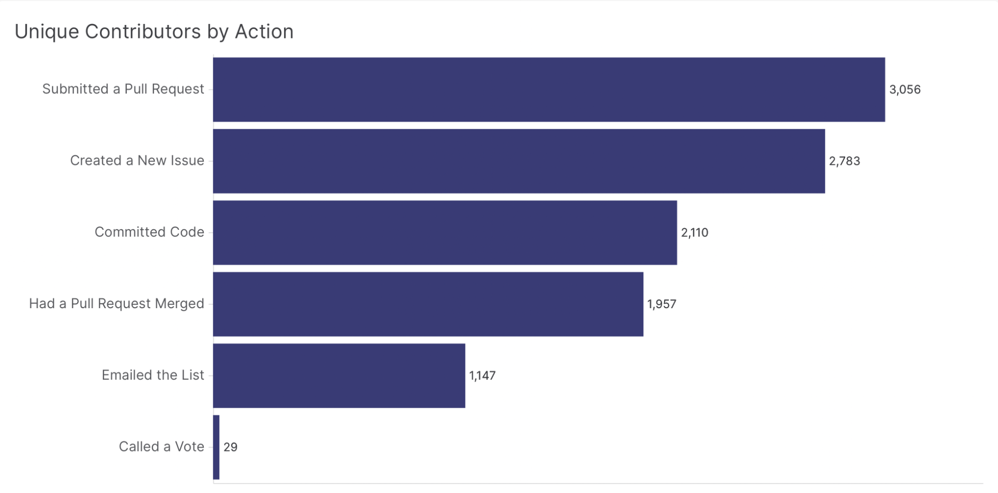 We also like to know whether the community is growing or shrinking, in terms of actual people as opposed to the activity they produce. Because the Airflow project produces complex software that covers a variety of use cases, we feel it’s important for it to have a sizable set of opinions and experiences to draw upon. A large community with a diverse enough perspective can easily overcome even the most complicated challenges.
