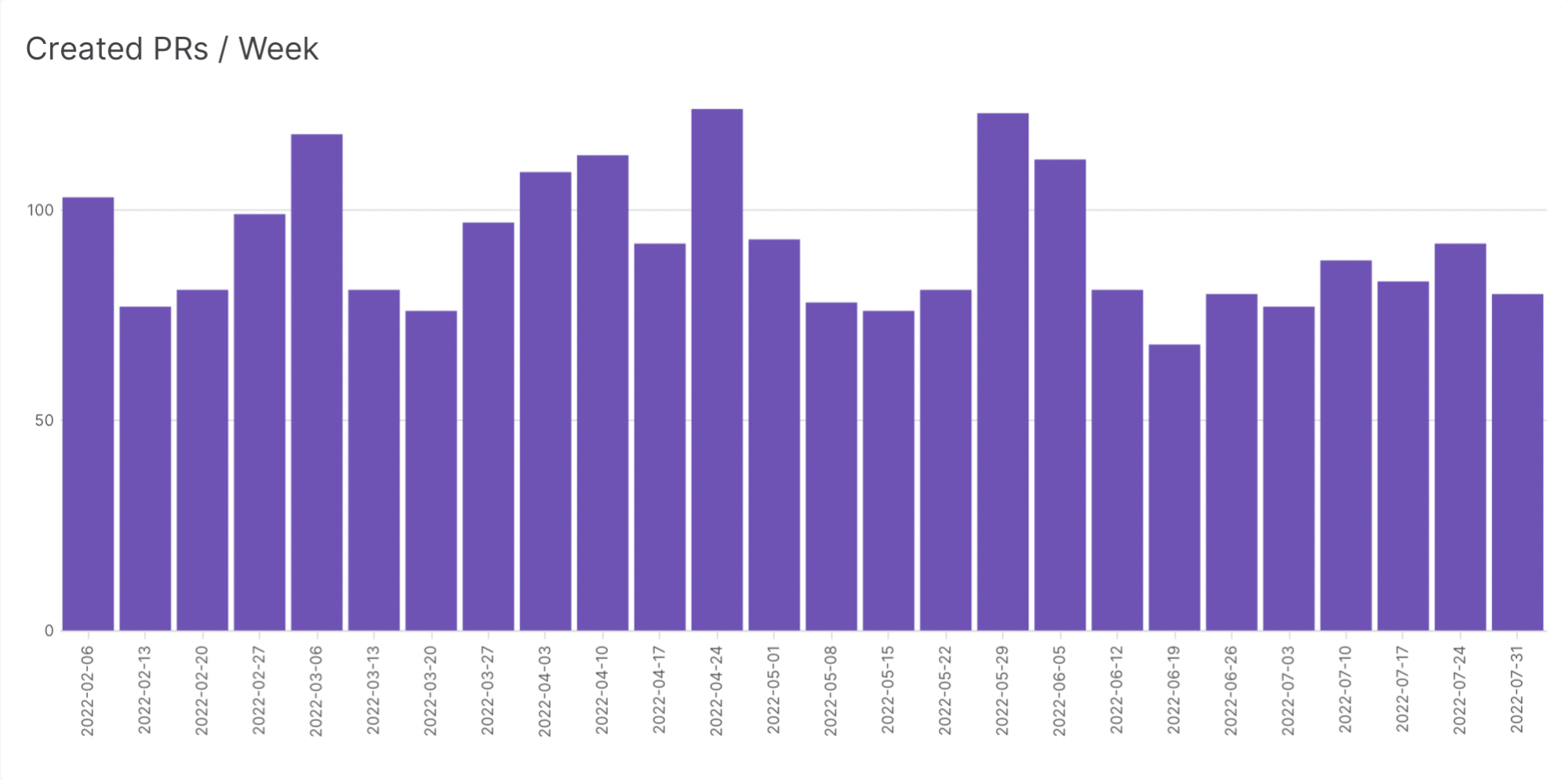 We gather metrics on the number of opened, closed, and merged pull requests nightly via the same Airflow DAG, and load them into our warehouse. That lets us see the number of created pull requests by week over the last six months: