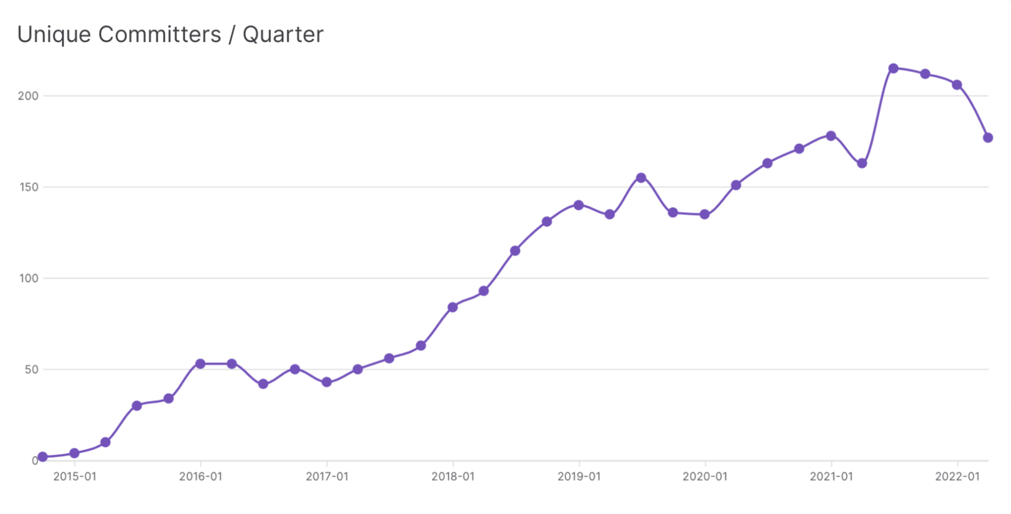 It also allows us to view population trends over time. For example, we can see that the community of code-writers within Airflow is steadily growing by looking at unique committers by quarter: