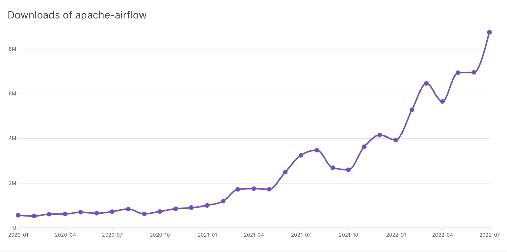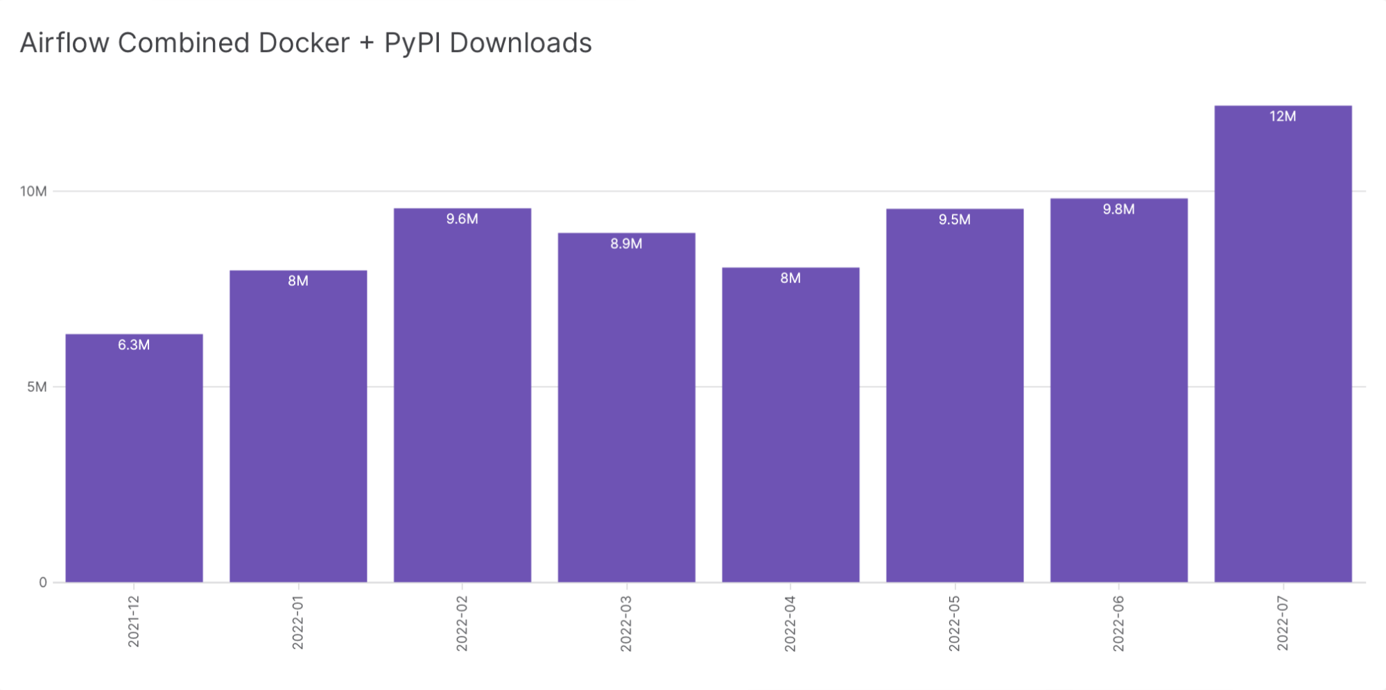 As you might expect, we have a keen interest in how much demand exists for Airflow. The “dream metrics” — the number of deployments running during a given day, the number of people who use Airflow — are unattainable. Once users download Airflow, they can use and redistribute it in many ways that cannot be studied through publicly available data sources. Downloads themselves, however, are easier to measure.