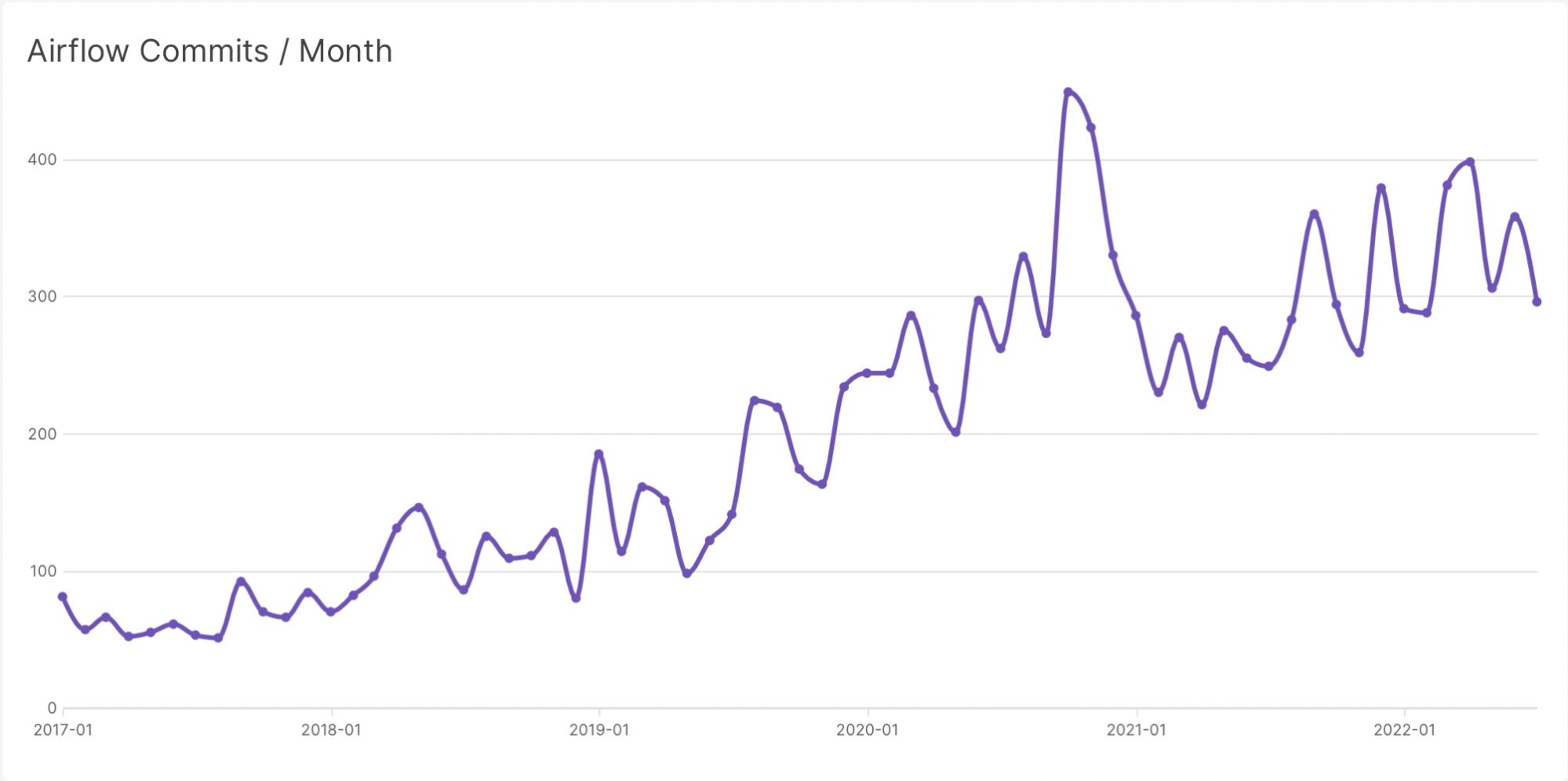 As a starting point, we look at the number of commits in the Airflow repository over time: