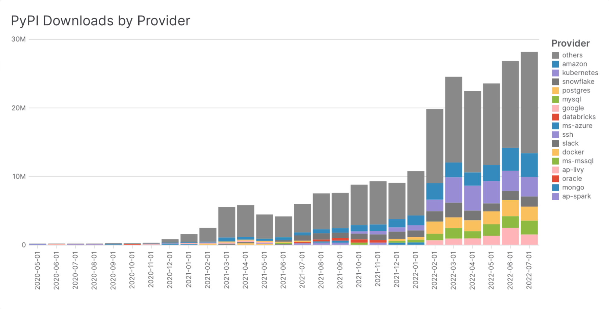 We also gather data on other Airflow packages. Studying the distribution of package downloads gives us a sense of which provider packages people are using most and, therefore, the systems people are using alongside Airflow most frequently:
