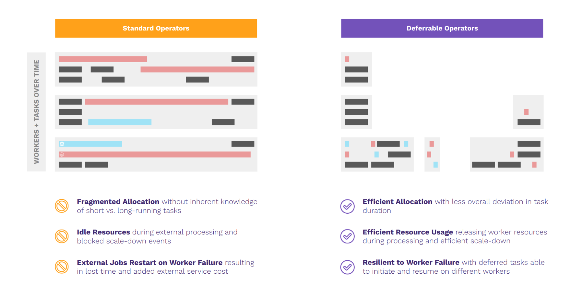 For users with long running tasks, Airflow 2.2 introduced async functionality as a generalization of AirBnB’s smart sensors. Standard operators and sensors take up a full worker slot for the entire duration of the task. Operators written to take advantage of the new asynchronous functionality can vacate the worker slot when they know they need to wait, ultimately saving resources.