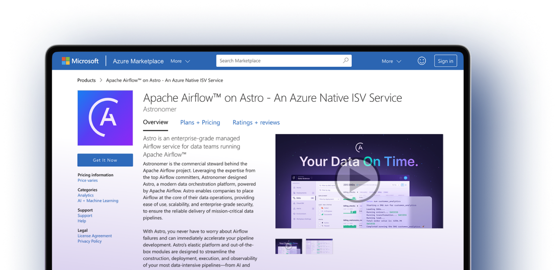 Using Astro's Apache Airflow® offering on Azure has modernized our data operations. Their best-in-class SLAs, multi-environment deployments, and intuitive dashboards have streamlined our processes, ensuring we can manage our critical pipelines.