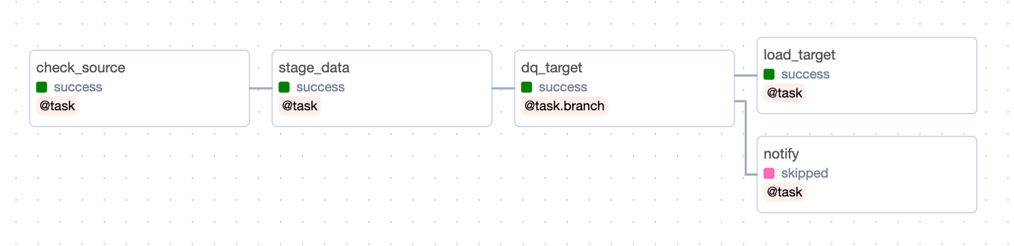to decide which path to take based on an output or stop processing immediately. These decorators empower you to control how your data pipeline behaves in expected scenarios or even edge-cases. In our case, we just have to modify ourdq_target