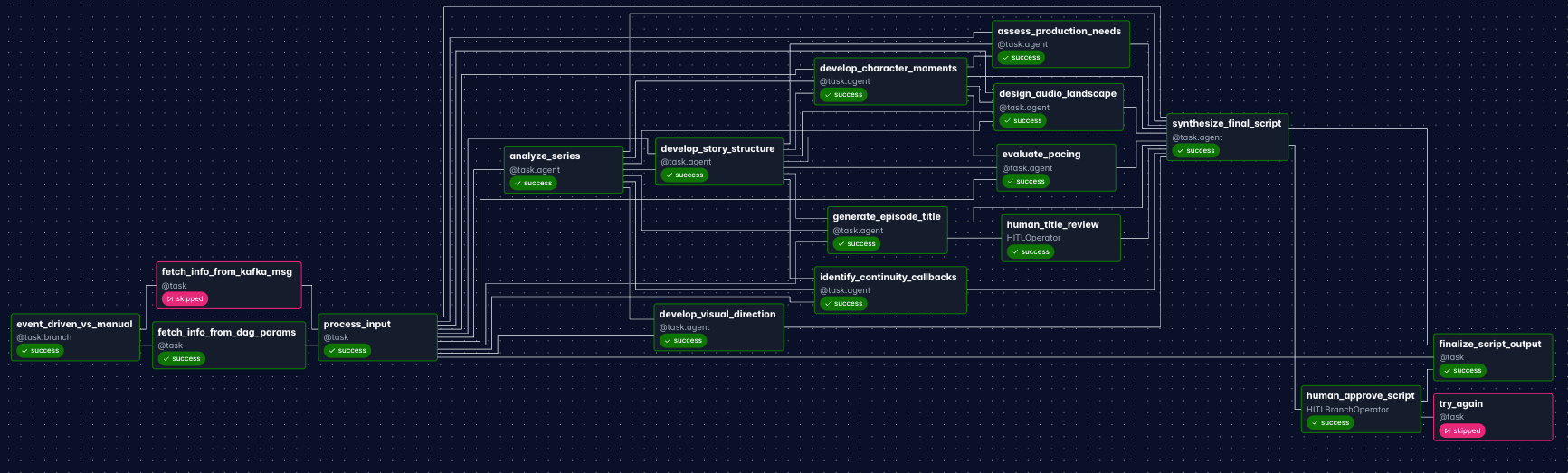 title_generator_agenthas come up with a list of potential episode titles, I want a human to either approve that list or provide an alternative title manually. - After the final episode script is ready, a human should decide if it is good enough or if the Dag should run again.