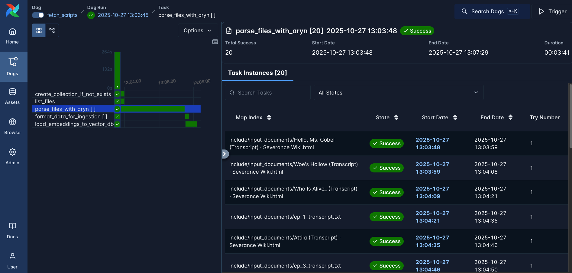 Of course I immediately wanted to test whether my data was stored correctly, so I wrote a small helper dag to directly query for any lines in Severance relating to the term “goat”. I was pleased with the output, shown in the code snippet below (redacted to avoid spoilers).