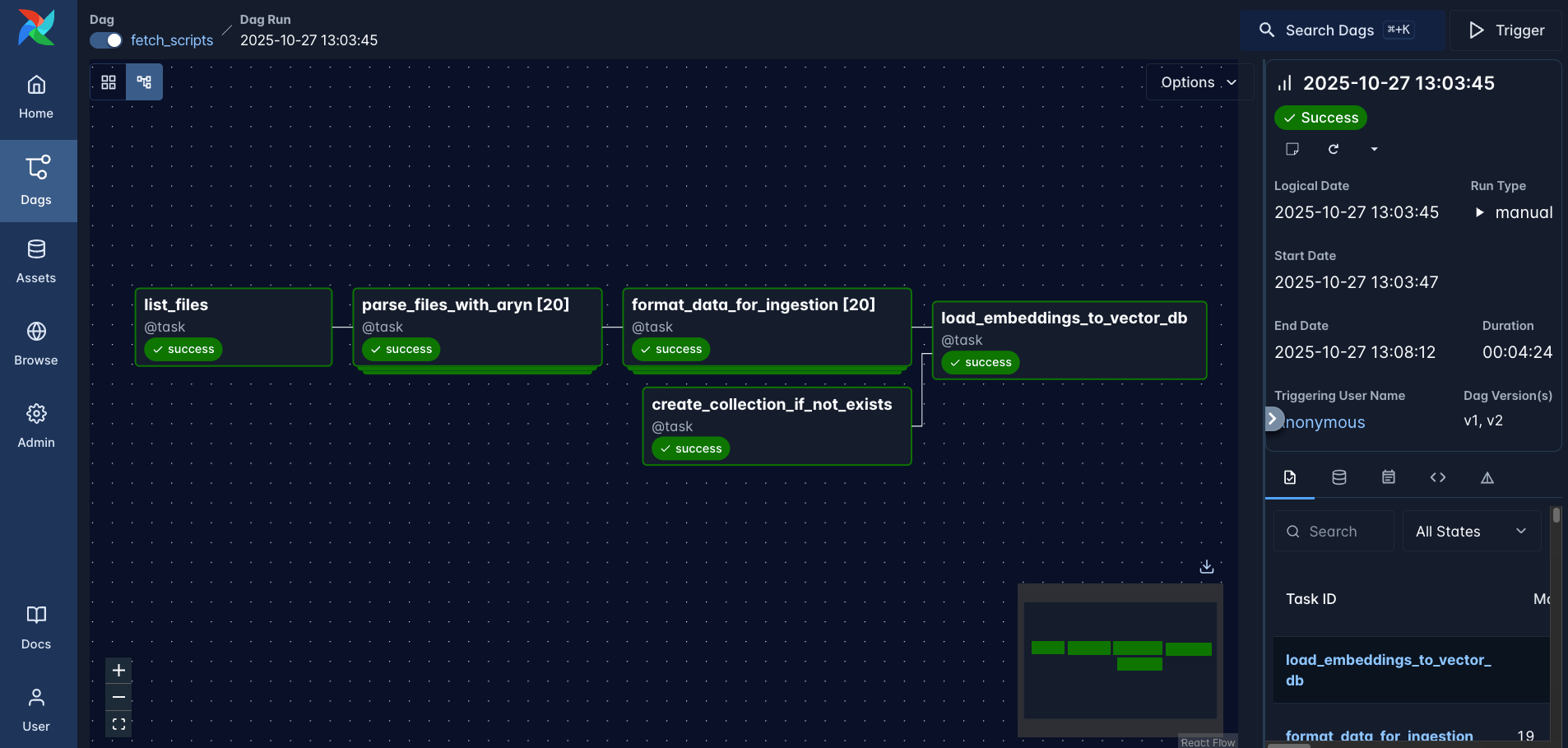 Figure 2: The RAG Dag processing files and loading them into the vector database to be accessed by the agent tool.
