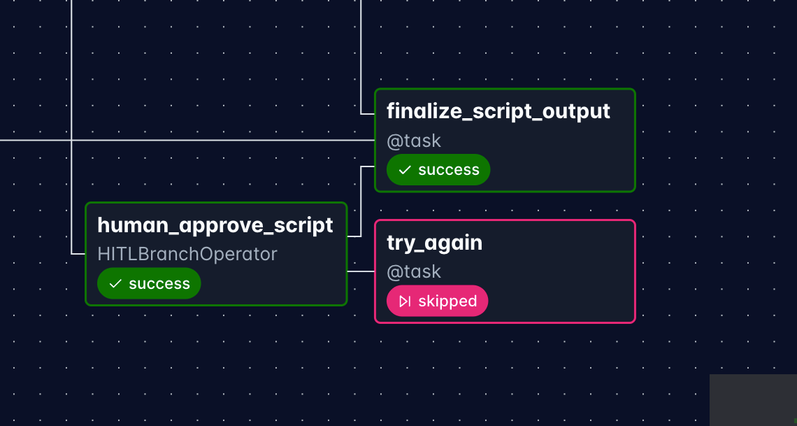 Of course our agents did a tremendous job and we can happily approve the script. Based on that decision, the downstream finalize_script_output task is executed and try_again is skipped.