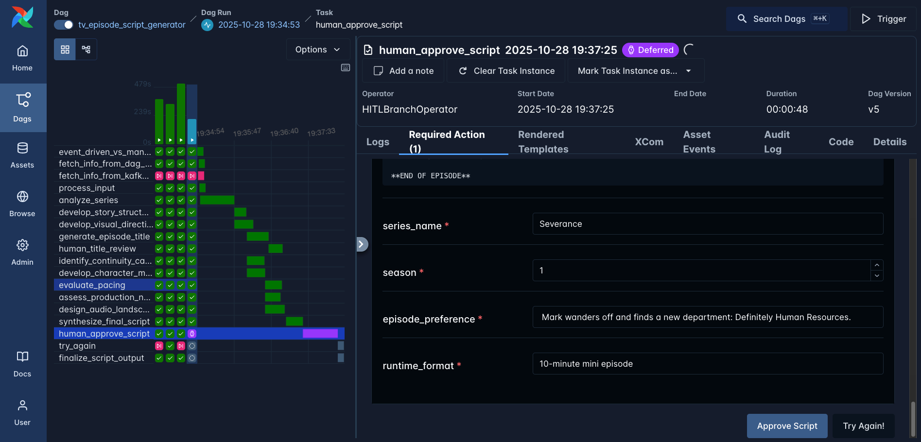 title_generator_agenthas come up with a list of potential episode titles, I want a human to either approve that list or provide an alternative title manually. - After the final episode script is ready, a human should decide if it is good enough or if the Dag should run again.