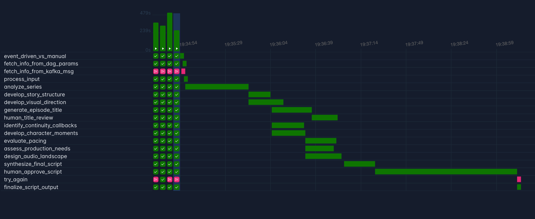Of course our agents did a tremendous job and we can happily approve the script. Based on that decision, the downstream finalize_script_output task is executed and try_again is skipped.