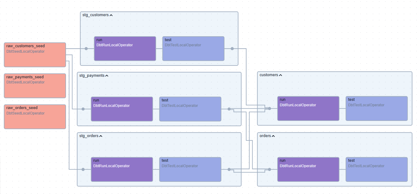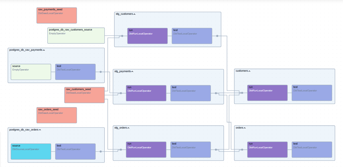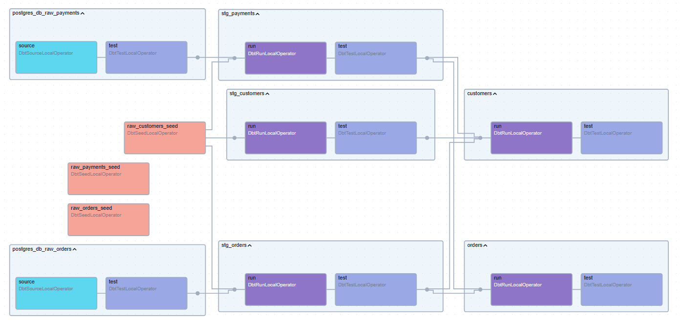 raw_customers: Rendered as EmptyOperatorraw_payments: Rendered as EmptyOperator and its tests rendered as a DbtTestOperatorraw_orders: Rendered as a DbtSourceOperator and its tests rendered as a DbtTestOperator