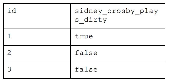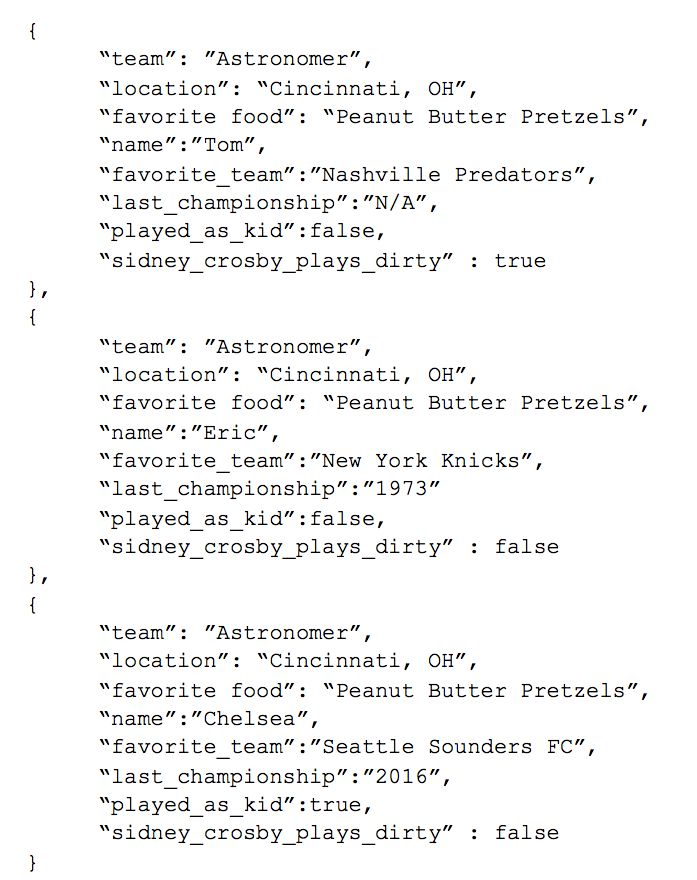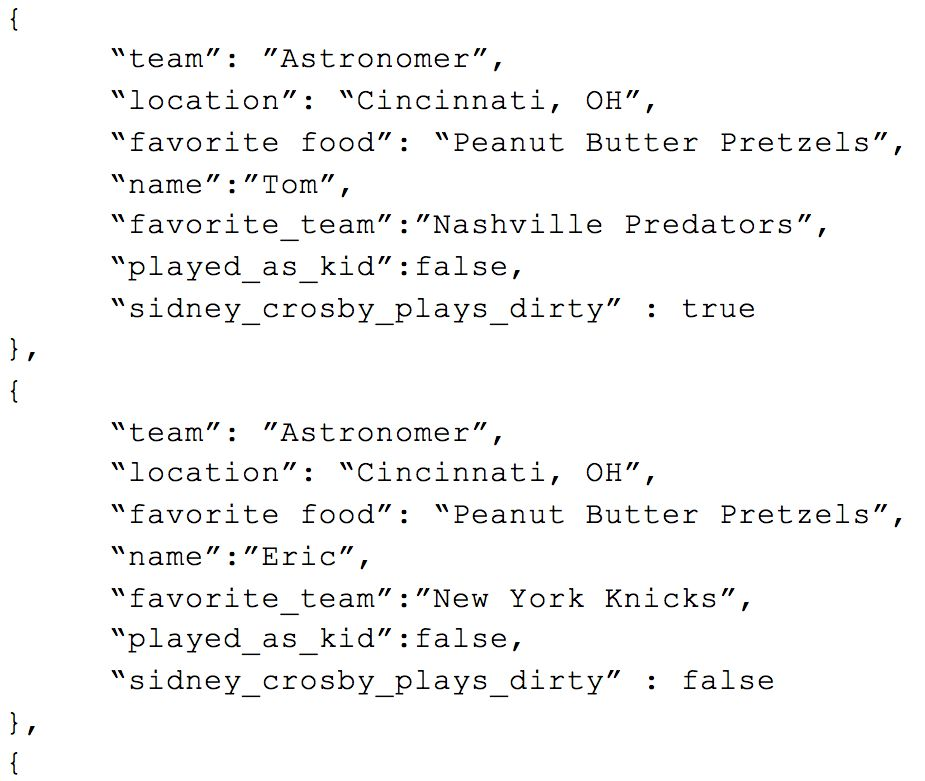 The values that were nested within the value of “hockey” have been moved up to the top level with the prefix “hockey_” added to them to ensure they are unique. Had we not included the “hockey_” to each value, we would have had a conflict between the two “favorite_team” values as one already exists at the top level. This process is called “flattening” -- whereas there used to be a complex structure, now they are all on the same row. This creates a greater uniformity between records and easier traversing for analysts.