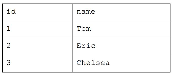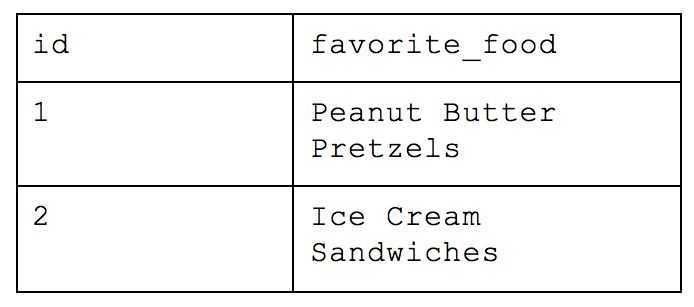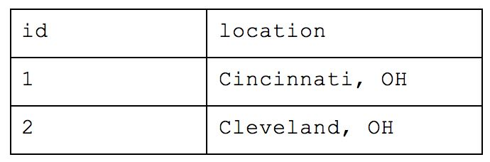 This organization is called First Normal Form, where all attributes are represented by individual columns and each value within that column represents an atomic value (e.g. name="Chelsea”; not name=[“Eric”,"Chelsea"]). This is very easy to conceptualize as a person new to database structure because it basically functions as any CSV or Excel file we may have used in the past and is thus very intuitive to analyze. If you want a count of people from Cincinnati, you only need to count how many rows are are in the table with the correct value in the location column.
