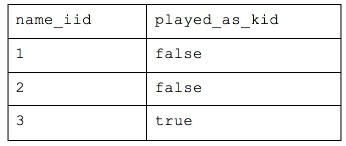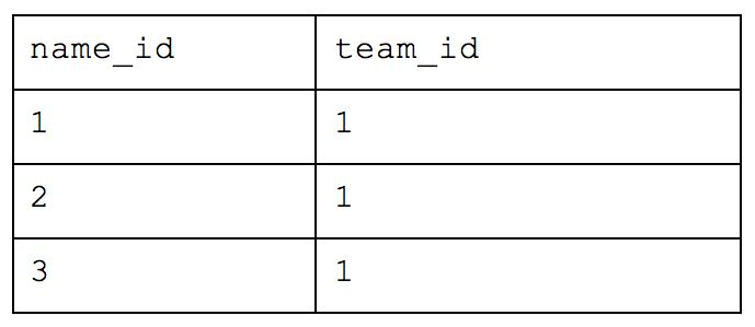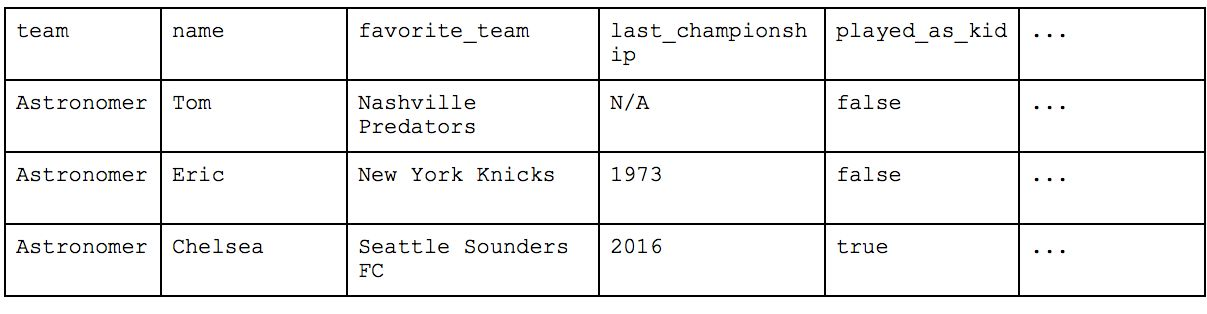 In our case, the key for our table is “name”—each person can have the same favorite_team or played_as_kid values but as long as their names are unique, the record itself is valid. Each unique key (name) relates directly to the “Team” but the inclusion of other values like “location” and “favorite_food” would violate 2NF as they have a direct relation to Astronomer. In the above example, Astronomer is the unique key of the first table as there could be multiple teams in Cincinnati and multiple teams who love Peanut Butter Pretzels but not of the second table as there can be multiple people who are on the Astronomer team.