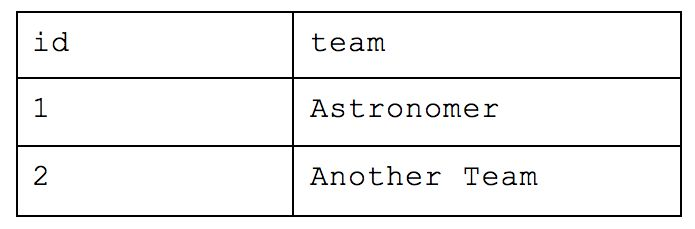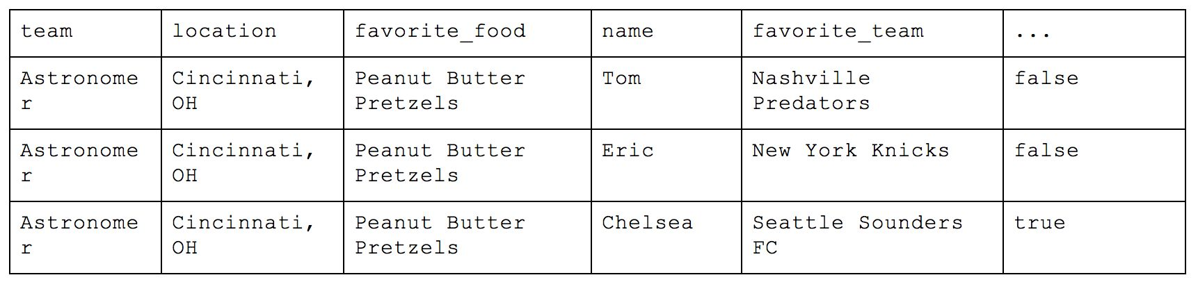 First Normal Form helps us create fewer tables but now we have a lot of duplicate data that we don’t need to unnecessarily include. We end up sacrificing storage for ease-of-use, and speed improvements by having minimal tables are likely a wash with the unnecessary data you end up traversing (unless your storage is columnar based, but that’s a whole other story). If Astronomer is in Cincinnati and the team’s favorite food is Peanut Butter Pretzels, those values don’t need to be explicitly repeated for each person on the Astronomer team. We could instead take the previous JSON object with the array of people and break up the response into two tables.