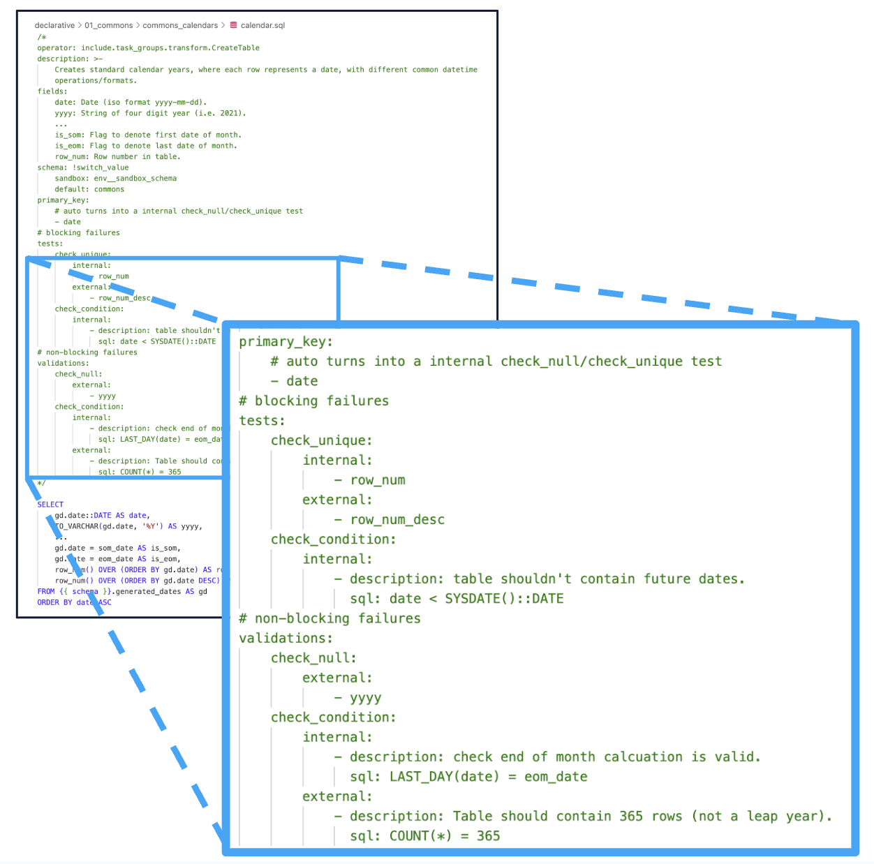 When we started orchestrating our data checks, we did it with a standalone DAG but the overhead of maintaining it made it hard to sustain and our testing coverage wasn’t very clear. Ideally, the tests should sit right alongside the respective data operations themselves. This keeps them within the data engineer’s regular workflow, making testing an integrated part of the development process rather than an additional, easily forgotten step.