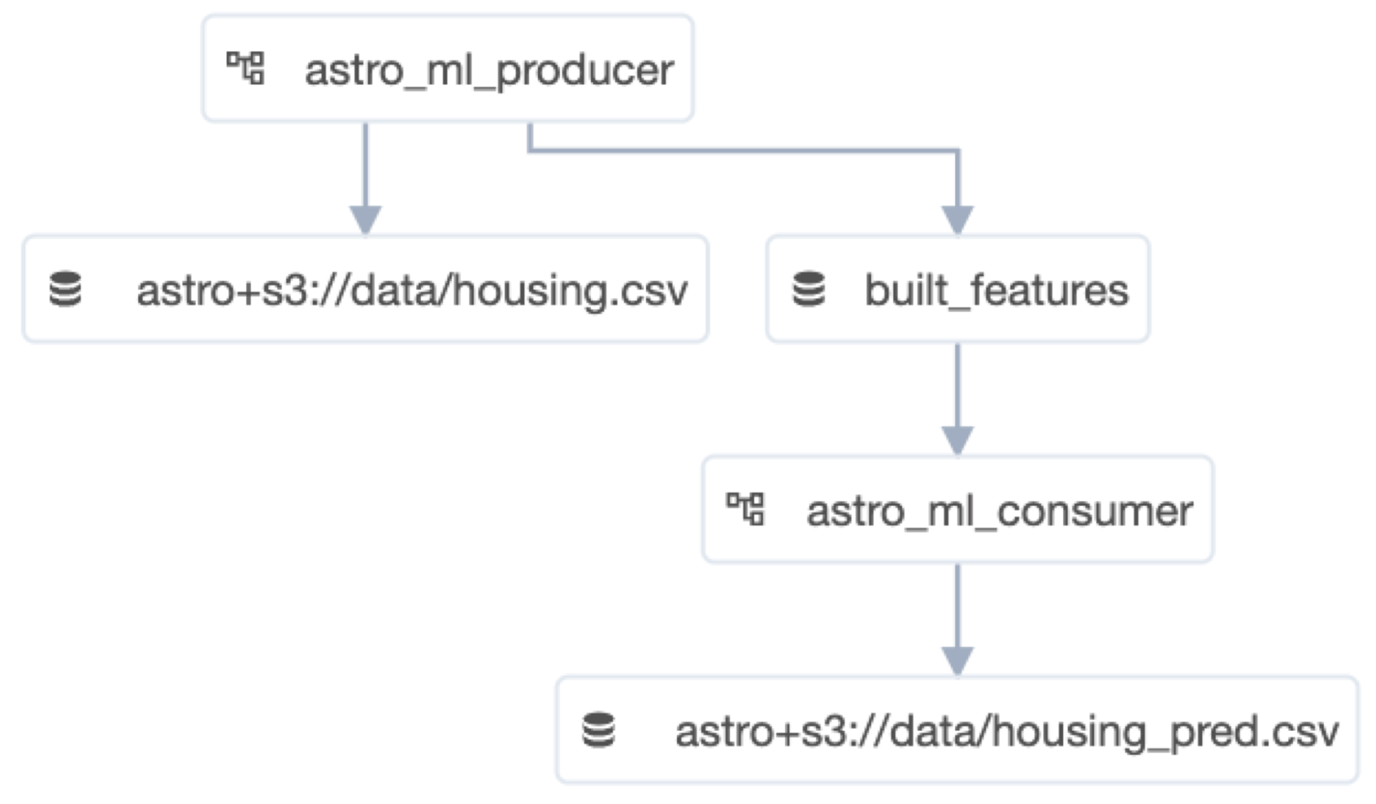 Figure 1: Here in the Datasets view, you can see the built_features dataset produced by the astro_ml_producer DAG is used to trigger the astro_ml_consumer DAG.
