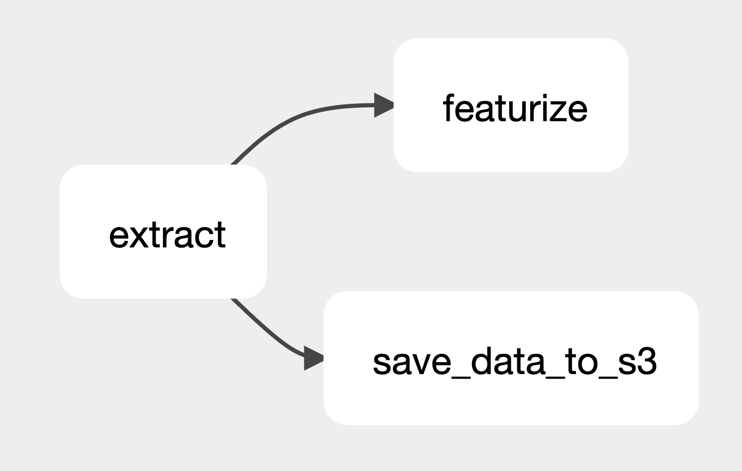 Figure 2: In this first producer DAG, raw data is loaded in the extract task, before the featurize task creates a feature-engineered dataset for the second Consumer DAG to use. In parallel, the raw data is saved for future comparison to predicted values.